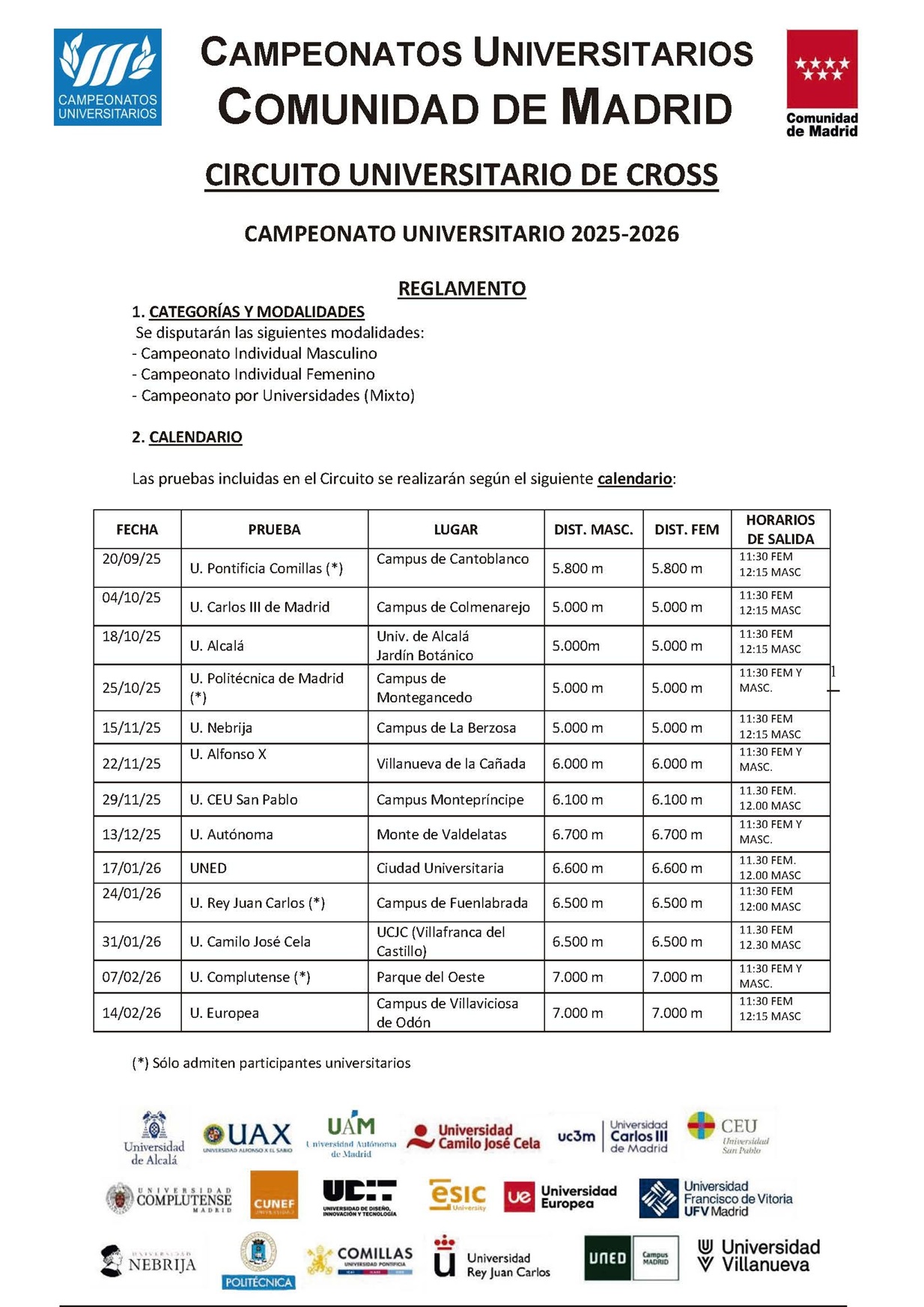 Ya se encuentra publicado el reglamento y calendario del circuito universitario de cross del curso 2025/2026. Al igual que el curso pasado: