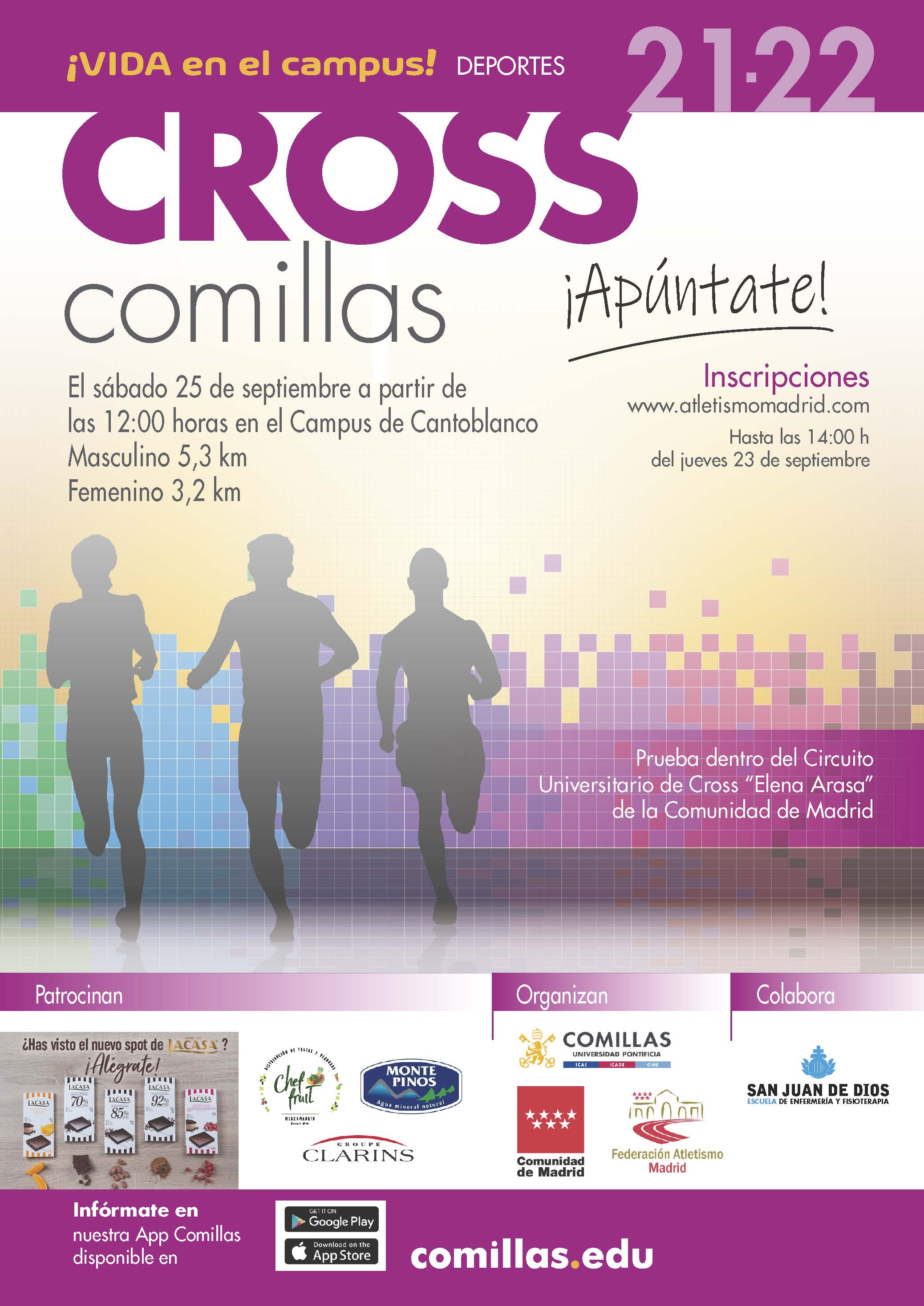 El sábado 25 de septiembre a las 12:00 horas la Universidad Pontificia Comillas organizará la primera prueba del Circuito Universitario de Cross de Madrid. Las inscripciones se podrán realizar a través de la plataforma Rock The Sport hasta el jueves 23 de septiembre a las 14:00 horas. En este evento solo podrán participar miembros de la comunidad universitaria de Madrid.